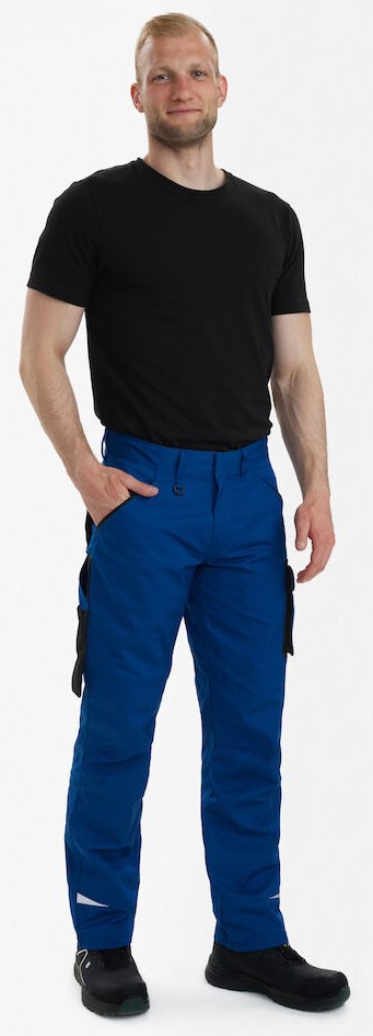 Funktionelle Arbeitshose mit vielen Details. Optimale Passform, u. a. sorgen ergonomisch geformte Knie und Panel an der Innennaht im Schritt für mehr Bequemlichkeit. Zwei geräumige, schräg sitzende Einschubtaschen vorne. Schlaufe mit D-Ring (vorne) zur Befestigung einer ID-Karte. Zwei geräumige Gesäßtaschen, die rechte mit Patte und Klettverschluss. Schenkeltasche mit Reißverschlusstasche fürs Handy, zusätzliche kleine Tasche. Zollstocktasche mit zusätzlichen Fächern. Die Zollstocktasche hat einen freihängenden Boden. Reflexstreifen unten an den Hosenbeinen für mehr Sichtbarkeit. Für Industriewäsche geeignet.