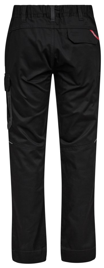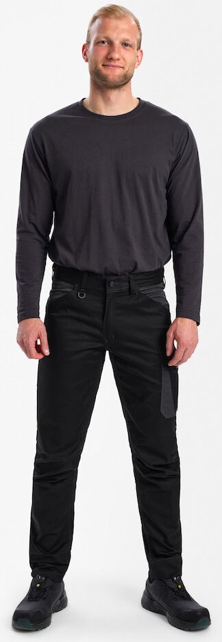 Zweifarbige Servicehose mit modernem Schnitt, bei der viel Wert auf eine gute Passform gelegt wurde. Die Servicehose ist aus einem Stoff gefertigt, der bei warmen und kälteren Temperaturen angenehm zu tragen ist. Die Hose hat vorgeformte Knie für maximale Bewegungsfreiheit sowie einen praktischen Gummizug hinten in der Taille, der für eine gute Passform sorgt und dafür, dass die Hose bei wiederholten Bewegungen nicht verrutscht. Bei der Entwicklung der Servicehose wurde der Schwerpunkt auf die Industrie gelegt. Sie verfügt über alle notwendigen funktionellen Details und ist auch für Fahrer, Lagermitarbeiter oder ähnliche Arbeitsfunktionen geeignet. Die Servicehose hat besonders viele funktionelle Taschen wie beispielsweise zwei geräumige schräge Taschen vorne. Gesäßtasche mit Klettverschluss. Auf der linken Seite eine Oberschenkeltasche mit Patte und separater Handytasche. Auf der rechten Seite befindet sich eine Innentasche, beispielsweise für eine Zollstocktasche oder ein Lineal. Für eine bessere Sichtbarkeit und Sicherheit hat die Hose funktionelle reflektierende Details vorne und hinten. Der Servicehose hat einen extra breiten Saum unten, der einfach ausgelassen werden kann, wenn zusätzliche Beinlänge erforderlich ist. Um die Hose zu verlängern, muss lediglich eine Naht aufgetrennt werden – einfach und problemlos. Das Hosenbein ist trotzdem noch gesäumt.