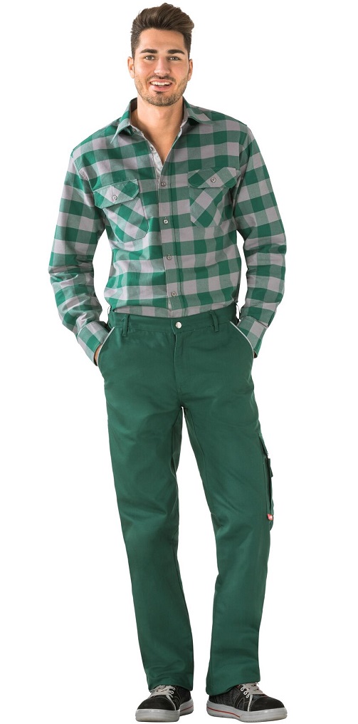 2 eingesetzte Beuteltaschen, rechts doppelte Maßstabtasche, Reflexbiesen an den Tascheneingriffen und den Taschenpatten, links Oberschenkeltasche mit Patte und Druckknöpfen, darauf aufgesetzte Handytasche, Gummizug im Bund, rechts 1 verstärkte Gesäßtasche, Rundbund mit 7 Gürtelschlaufen und Jeansknopf, Reißverschluss im Hosenschlitz.