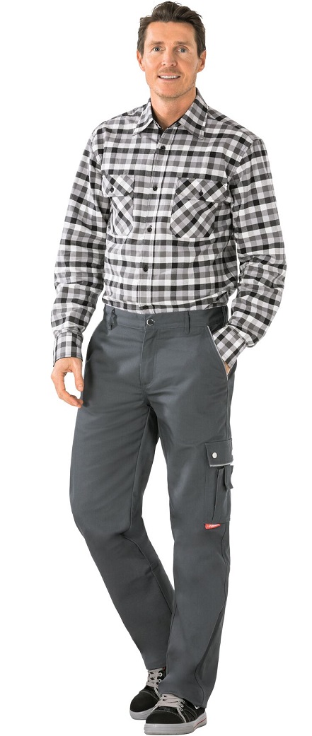 2 eingesetzte Beuteltaschen, rechts doppelte Maßstabtasche, Reflexbiesen an den Tascheneingriffen und den Taschenpatten, links Oberschenkeltasche mit Patte und Druckknöpfen, darauf aufgesetzte Handytasche, Gummizug im Bund, rechts 1 verstärkte Gesäßtasche, Rundbund mit 7 Gürtelschlaufen und Jeansknopf, Reißverschluss im Hosenschlitz.
