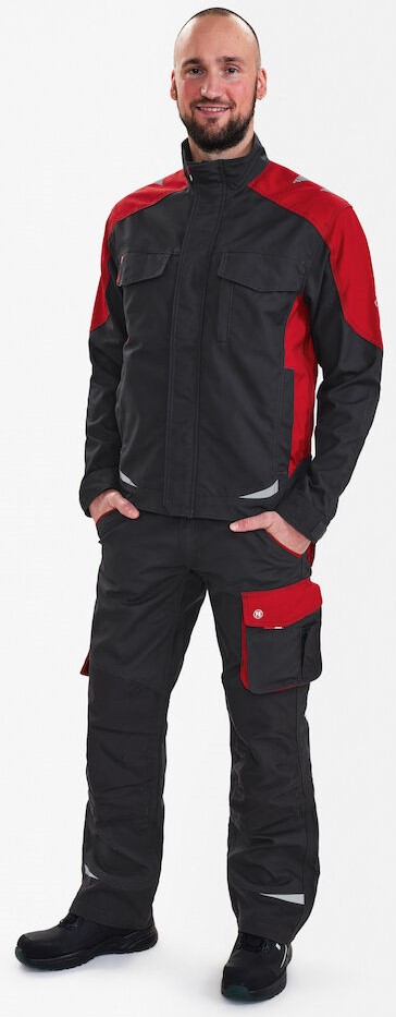 Funktionelle Arbeitsjacke mit vielen Details. Verlängerte Rückenpartie mit Bewegungsfalte. Verdeckter Reißverschluss vorn. Verstärkte Ellbogen. Zwei geräumige Einschubtaschen. Zwei Brusttaschen mit Patte – die rechte mit Schlaufe und D-Ring zur Befestigung einer ID-Karte, die linke mit zusätzlicher Reißverschlusstasche fürs Handy. Zwei große Innentaschen mit Klettverschluss. Verstellbare Ärmelbündchen. Reflexstreifen auf den Schultern sowie vorne und hinten für mehr Sichtbarkeit. Für Industriewäsche geeignet.