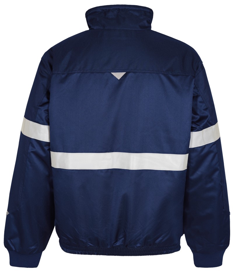 Pilotjacke mit doppelt verdecktem Kunststoffreißverschluss in passendem Farbdesign. Schultern und Ärmel verstärkt. Dunkel gefärbte Druckknöpfe. Brusttasche links mit seitlichem Eingriff mit Reißverschluss. Offene Brusttasche mit verschließbarer Handytasche rechts. Zwei Eingrifftaschen. Innentasche mit Reißverschluss. Strickbündchen an den Ärmeln. Elastischer Bund. Kragen mit Schnurstopper verstellbar. Faserpelz im Kragen und am Körper. Reißverschluss im hinteren, unteren Rückenbereich, um die Jacke für Transfers und Embleme leichter handhaben zu können. Wind- und wasserabweisend. Die Jacke ist mit Reflexstreifen um Ärmel und Taille ausgestattet.