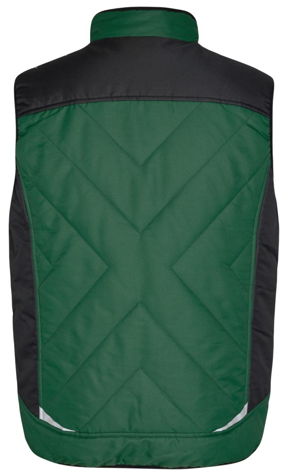 Warme Winterweste mit hohem Kragen und verlängerter Rückenpartie. Weiches Microfleece innen im Kragen. Frontreißverschluss. Zwei geräumige Einschubtaschen und eine Brusttasche, alle mit Reißverschluss. Innentasche ebenfalls mit Reißverschluss. Die Weste hat einen Gummizug in Bund und Armöffnungen, sodass weniger Wind eindringt.