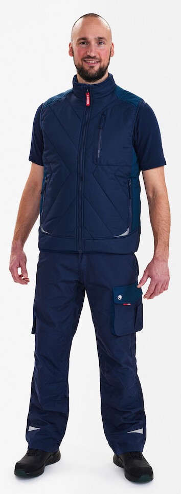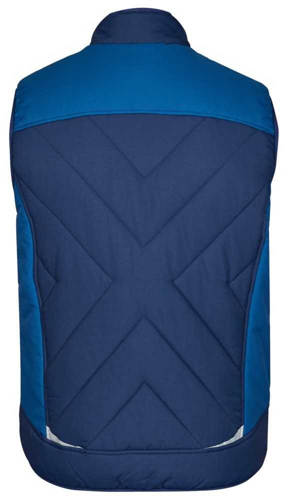 Warme Winterweste mit hohem Kragen und verlängerter Rückenpartie. Weiches Microfleece innen im Kragen. Frontreißverschluss. Zwei geräumige Einschubtaschen und eine Brusttasche, alle mit Reißverschluss. Innentasche ebenfalls mit Reißverschluss. Die Weste hat einen Gummizug in Bund und Armöffnungen, sodass weniger Wind eindringt.