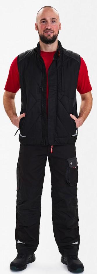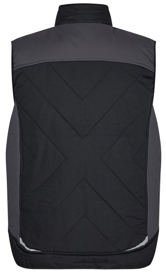 Warme Winterweste mit hohem Kragen und verlängerter Rückenpartie. Weiches Microfleece innen im Kragen. Frontreißverschluss. Zwei geräumige Einschubtaschen und eine Brusttasche, alle mit Reißverschluss. Innentasche ebenfalls mit Reißverschluss. Die Weste hat einen Gummizug in Bund und Armöffnungen, sodass weniger Wind eindringt.