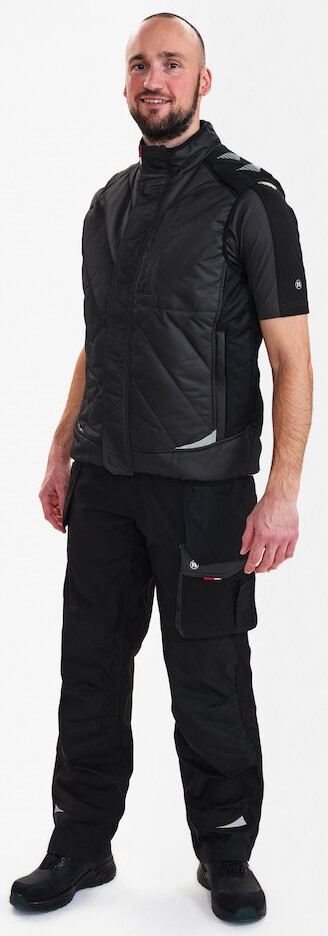 Warme Winterweste mit hohem Kragen und verlängerter Rückenpartie. Weiches Microfleece innen im Kragen. Frontreißverschluss. Zwei geräumige Einschubtaschen und eine Brusttasche, alle mit Reißverschluss. Innentasche ebenfalls mit Reißverschluss. Die Weste hat einen Gummizug in Bund und Armöffnungen, sodass weniger Wind eindringt.
