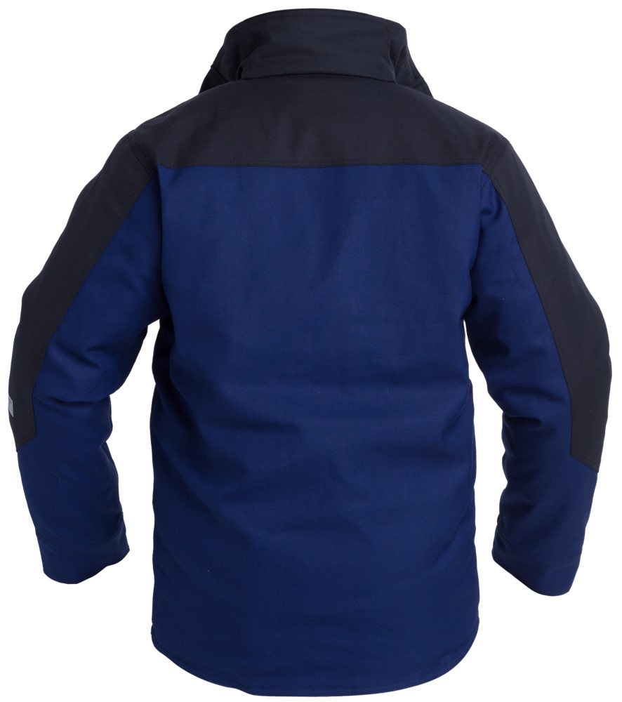 Winterjacke mit doppelter Knopfleiste, verdeckten Druckknöpfen und Metallreißverschluss vorne. Brusttaschen mit Patte und Klettverschluss, beide mit Handytasche. Zwei Innentaschen mit Reißverschluss. Zwei Seitentaschen mit Patte und Klettverschluss. Die Jacke ist mit flammhemmendem Steppfutter sowie einer Membrane ausgestattet, die Wasserdurchtritt verhindert. Praktische Details an Taschen und Nähten verhindern, dass Funken hängen bleiben. Antistatisch, flammhemmend und schützend vor Aerosolen, Spray und leichten Spritzern von Chemikalien.