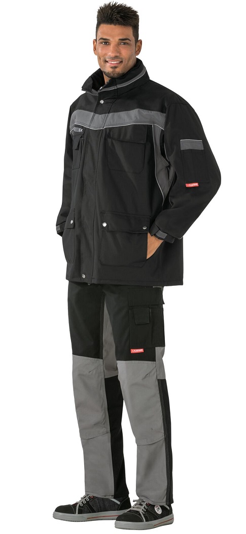 Atmungsaktiv, wasserdicht, Nähte hinterklebt, Fleecekragen, Reflexbiesen als Sicherheitsausstattung, Kapuze im Kragen, 1 Brusttasche links mit Patte und Klettverschluss, doppelte Brust-tasche rechts, Handytasche auf der rechten Brust, 2 Stiftfächer, 2 seitliche Einschubtaschen, 2 aufgesetzte Seitentaschen, Ärmeltasche links, Dokumententasche unter der Frontpatte, Netzfutter innen, verdeckter Frontreißverschluss, mit Klettverschluss verstellbare Ärmelbündchen.