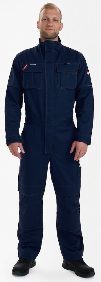 Funktionelle Overall aus 100 % Baumwolle mit Kontrastnähten. Optimale Passform u. a. mit ergonomisch geformtem und verstärktem Knie. Verdeckter Reißverschluss und Klettverschluss vorne. Der elastische Taillenbund hinten sorgt für eine gute Passform und einen sicheren Sitz der Kombination. Brusttaschen mit Unterteilungen und D-Ring. Die Kombination hat zwei geräumige Schrägtaschen, jeweils mit Eingrifftaschen, über die man Zugriff auf die darunter getragene Hose erhält. Zollstocktasche mit freihängendem Boden für optimale Bewegungsfreiheit. Alle Taschen werden mit Klettpatte geschlossen. Verstellbare Hammerschlaufe. Reflektierende Paspeln hinten in der Mitte des Beins sorgen für mehr Sichtbarkeit. Verstärkte Knietaschen mit zwei Einstellungsmöglichkeiten für Kniekissen. Breiter Saum unten, der ausgelassen werden kann, wenn zusätzliche Beinlänge erforderlich ist. Um die Hose zu verlängern, muss lediglich eine Naht aufgetrennt werden. Das Hosenbein ist trotzdem noch gesäumt.