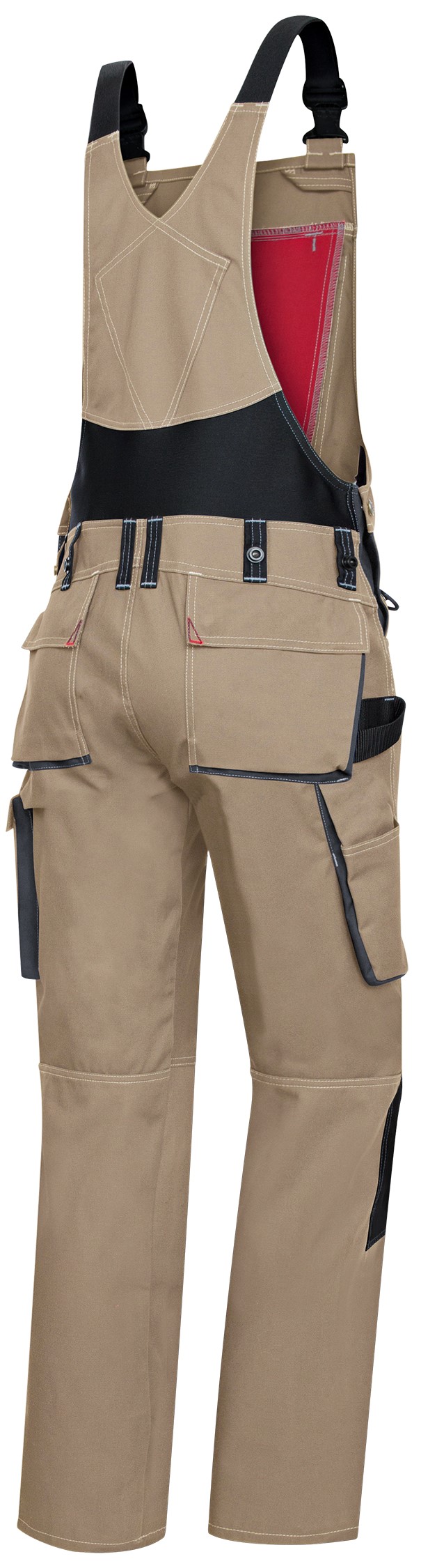 - Stretchträger mit Kunststoff-Steckschnallen, doppelte Latztasche mit Reißverschluss und Taschenklappe, 2 Stifttaschen, hochgezogener Rücken mit Stretcheinsatz für mehr Bewegungsfreiheit, regulierbare Bundweite