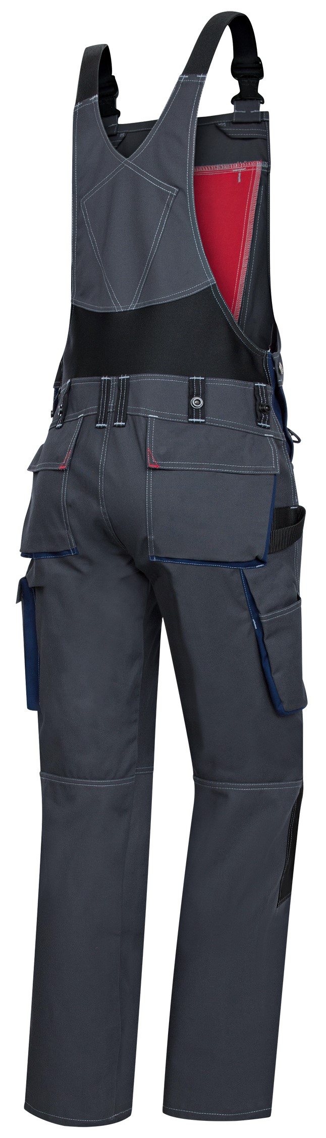 - Stretchträger mit Kunststoff-Steckschnallen, doppelte Latztasche mit Reißverschluss und Taschenklappe, 2 Stifttaschen, hochgezogener Rücken mit Stretcheinsatz für mehr Bewegungsfreiheit, regulierbare Bundweite