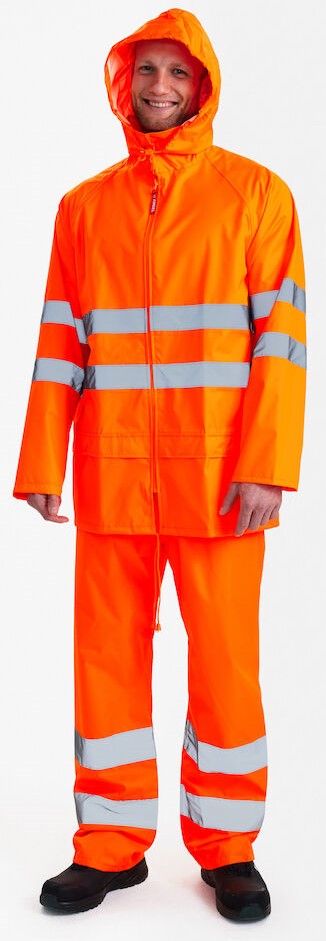 Leichtes und praktisches Regenset aus Jacke und Hose. Die Jacke hat einen Reißverschluss vorn. Zwei Vordertaschen. Verstellbare Kapuze, die sich zusammenrollen lässt, wenn sie nicht gebraucht wird. Verstellbar am Bund und an den Manschetten. Die Hose hat einen Gummizug an der Taille. Durchgriff zu den Taschen. Verstellbar unten an den Hosenbeinen. Reflexstreifen um Ärmel, Bund und Beine. Verschweißte Nähte. Bekleidungsklasse 3 (Jacke). Bekleidungsklasse 2 (Hose).