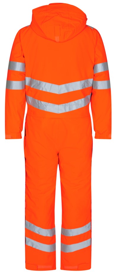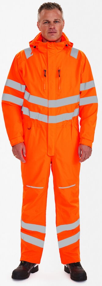 Fluoreszierende, atmungsaktive sowie wasser- und winddichte Winteroverall mit verschweißten Nähten und hohem Kragen im modernen Design. Doppelte Knopfleiste mit Reißverschluss sowie Klettverschluss vorne. Zwei geräumige Seitentaschen mit Klettverschluss. Zwei Brusttaschen und eine Reißverschluss-Handytasche, durch die man ein Kabel durchziehen kann. Abnehmbare Kapuze mit ausreichend Platz für den Arbeitshelm. Rippendetail im Lendenbereich hinten, das für gute Passform und Bewegungsfreiheit sorgt. Knieverstärkung. Verstellbare Bündchen an den Ärmeln und an den Hosenbeinen unten. Reißverschluss an der Außenseite beider Hosenbeine. Reißverschluss im Futter, geeignet für Aufdruck/Stickerei. Reflexstreifen über die Schulterpartie hinweg sowie rund um Ärmel, Taille und Beine. Bekleidungsklasse 3. Nach 50 mal Waschen getestet.