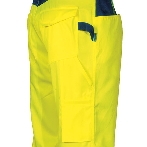 2 mit Klettverschluss verschlossene Gesäßtaschen, wobei eine mit Patte, 3 umlafende reflektierende Streifen an den Beinen, breite Vordertaschen, ergonomische Gestaltung an den Knien, Hammerschlaufe, justierbarer Bund, linke seitlche Tasche mit Patte und Übertasche für Objekte und Stifte, verstärkter Schritt, Zollstocktasche