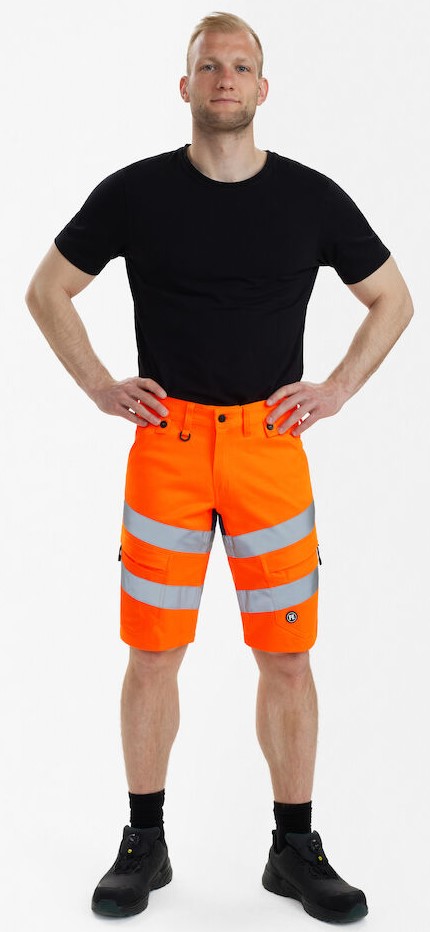 Dehnbare, funktionelle und fluoreszierende Shorts im modernen Design. Optimale Passform. Der dehnbare Stoff sorgt für optimale Bewegungsfreiheit und Komfort. D-Ring vorne für die Befestigung von z. B. Ausweisen. Zwei geräumige Schrägtaschen vorne. Zwei Gesäßtaschen. Zwei Schenkeltaschen mit Reißverschluss. Die linke Schenkeltasche hat eine zusätzliche Handytasche. Die rechte Schenkeltasche hat eine aufgesetzte verstärkte Zollstocktasche mit zusätzlichen Unterteilungen. Bekleidungsklasse 1. Nach 50 mal Waschen getestet.