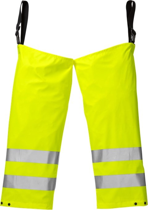 Robuste Warnschutz-Regenbekleidung als Überziehhose, die mit verstellbaren Gummischlaufen am Gürtel der eigentlichen Hose befestigt wird.