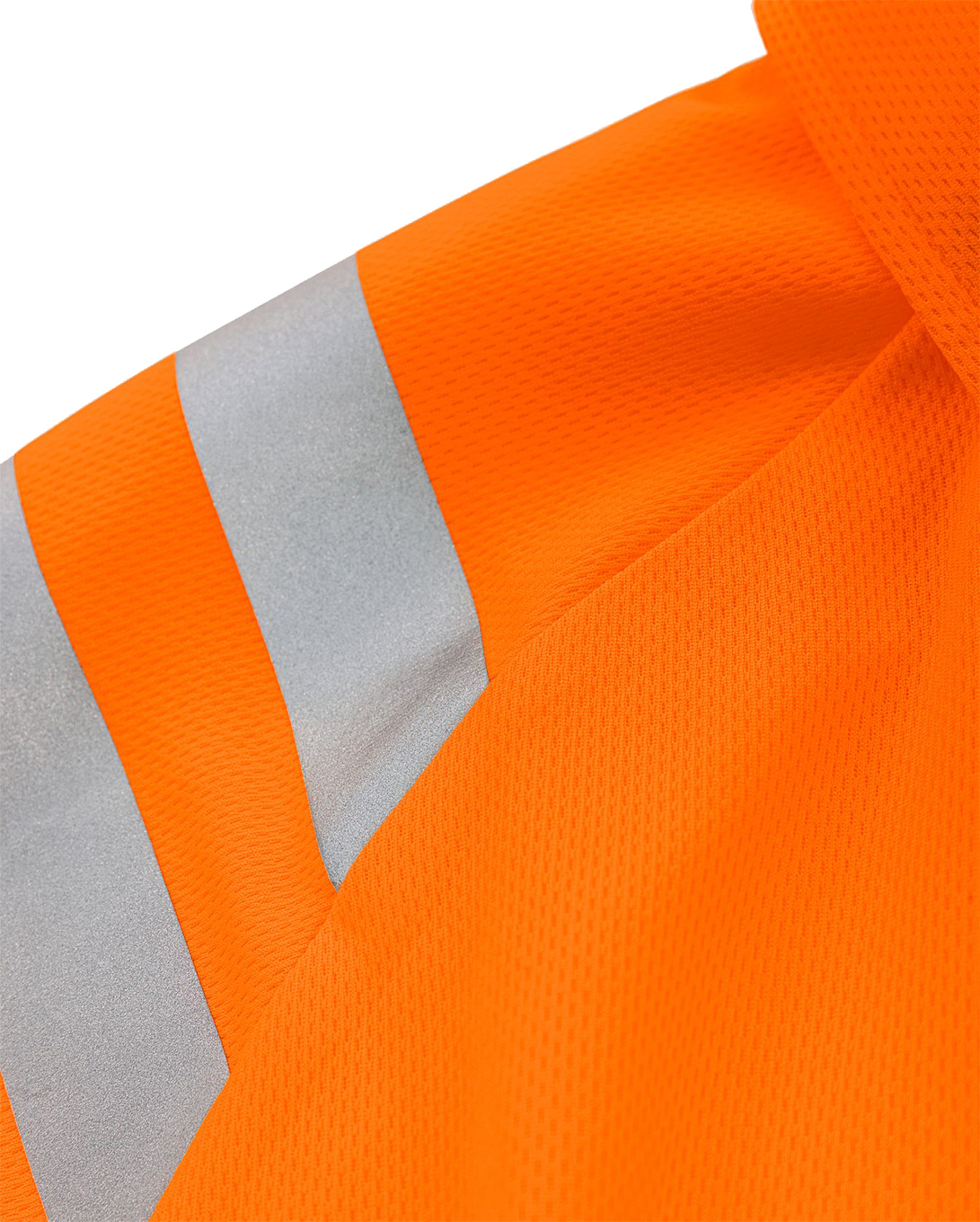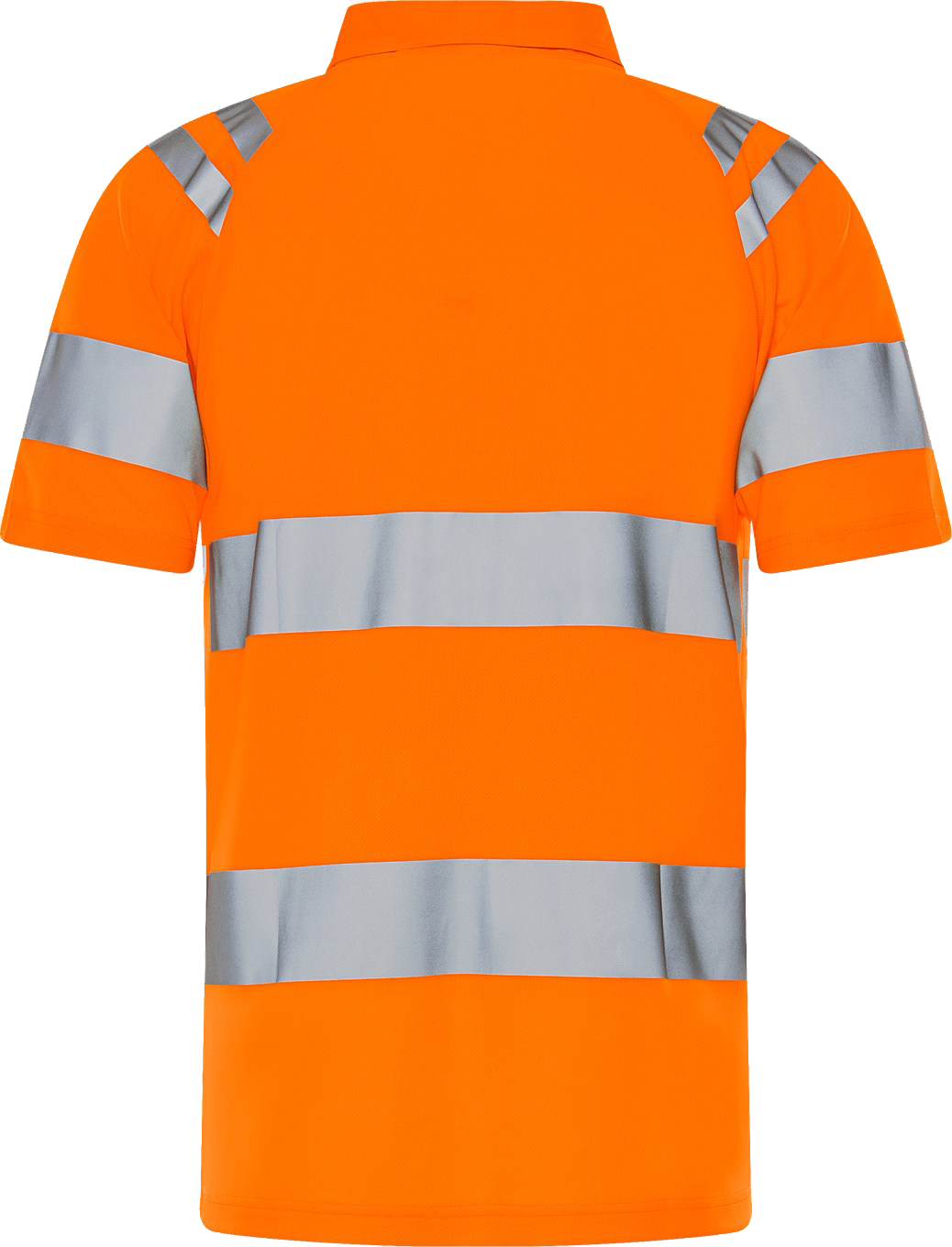 Warnschutz-Poloshirt aus recyceltem Material in einem Funktionsstrick für bessere Atmungsaktivität. Dieses leichte und luftige Poloshirt ist eine gute Wahl für warme Arbeitstage. Konzept: Trofta
