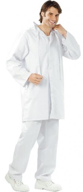 Mit diesem praktischen Mantel erhalten Sie Hygiene am Stück: Durch die fest verbundene Kapuze gehen Sie kein Risiko ein, dass Haare oder Teile der Kleidung in die Verarbeitung geraten. Angelehnt an die Empfehlungen der HACCP und der DIN 10524 für Lebensmittelhygiene. Kapuze, verdeckte Druckknopfleiste, 2 seitliche Eingrifftaschen, mit Patten und Druckknöpfen zu verschließen, 1 Innentasche rechts, 1 Innentasche und Handytasche links, mit Druckknopf verstellbare Ärmelbündchen, Gewebe im Schulterbereich und an der Oberseite der Ärmel doppellagig.