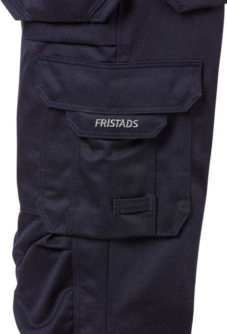 Flammschutzhose, zertifiziert gemäß Warnschutznorm Klasse 1. Handwerkermodell aus haltbarem, bequemen, flammhemmend behandeltem Material mit Knietaschen aus flammhemmendem CORDURA®. Für 50 industrielle Wäschen getestet.