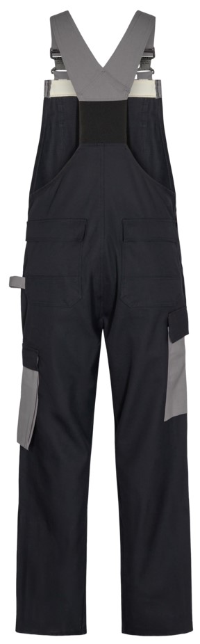 Latzhose mit Brusttasche mit Reißverschluss, zwei mit Patte verdeckte Einschubtaschen, verstärkte Gesäßtaschen mit Patte, Hammerschlaufe, Zollstocktasche, Knieverstärkung/Knietaschen mit Klettverschluss unten. Funktionelle Details bei Taschen und Bund verhindern das Festsetzen der Funken. Antistatisch, flammhemmend und schützend vor Aerosolen, Spray und leichten Spritzern von Chemikalien.