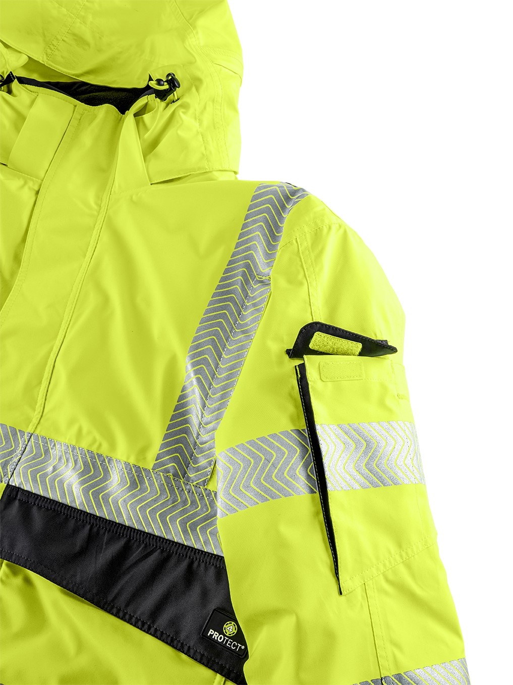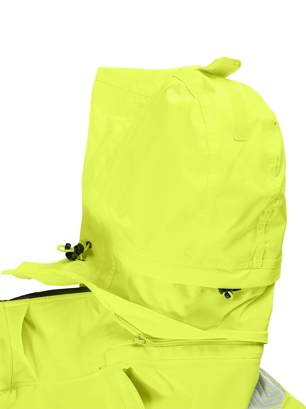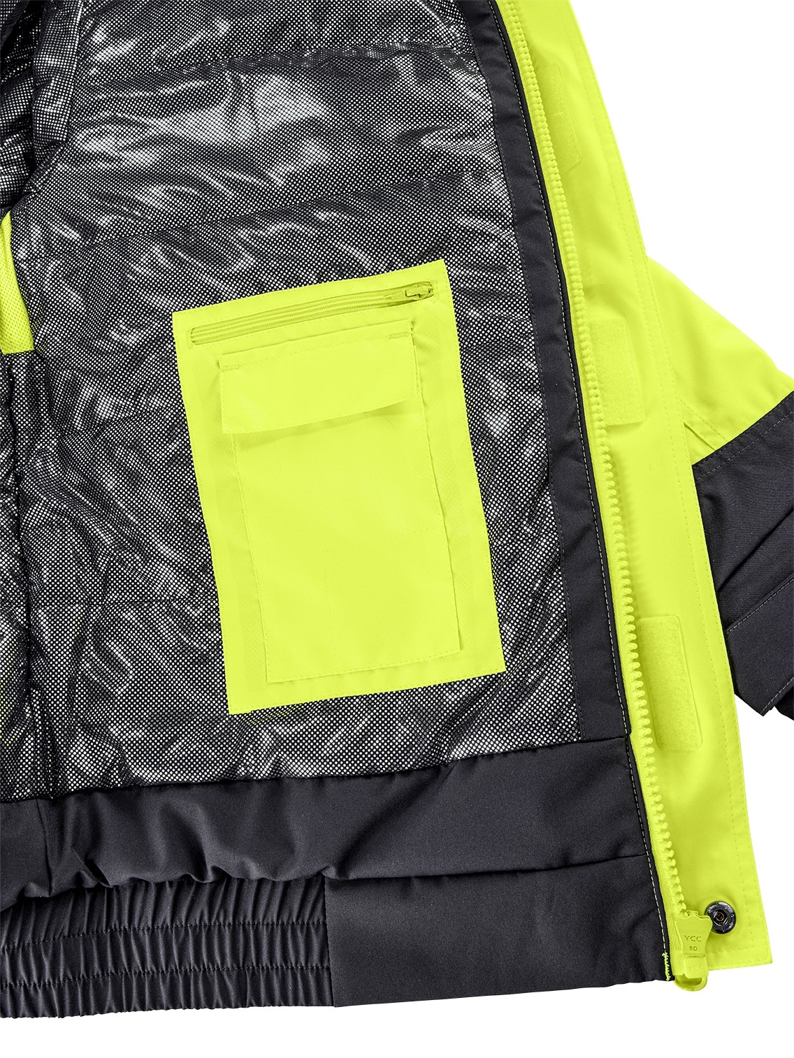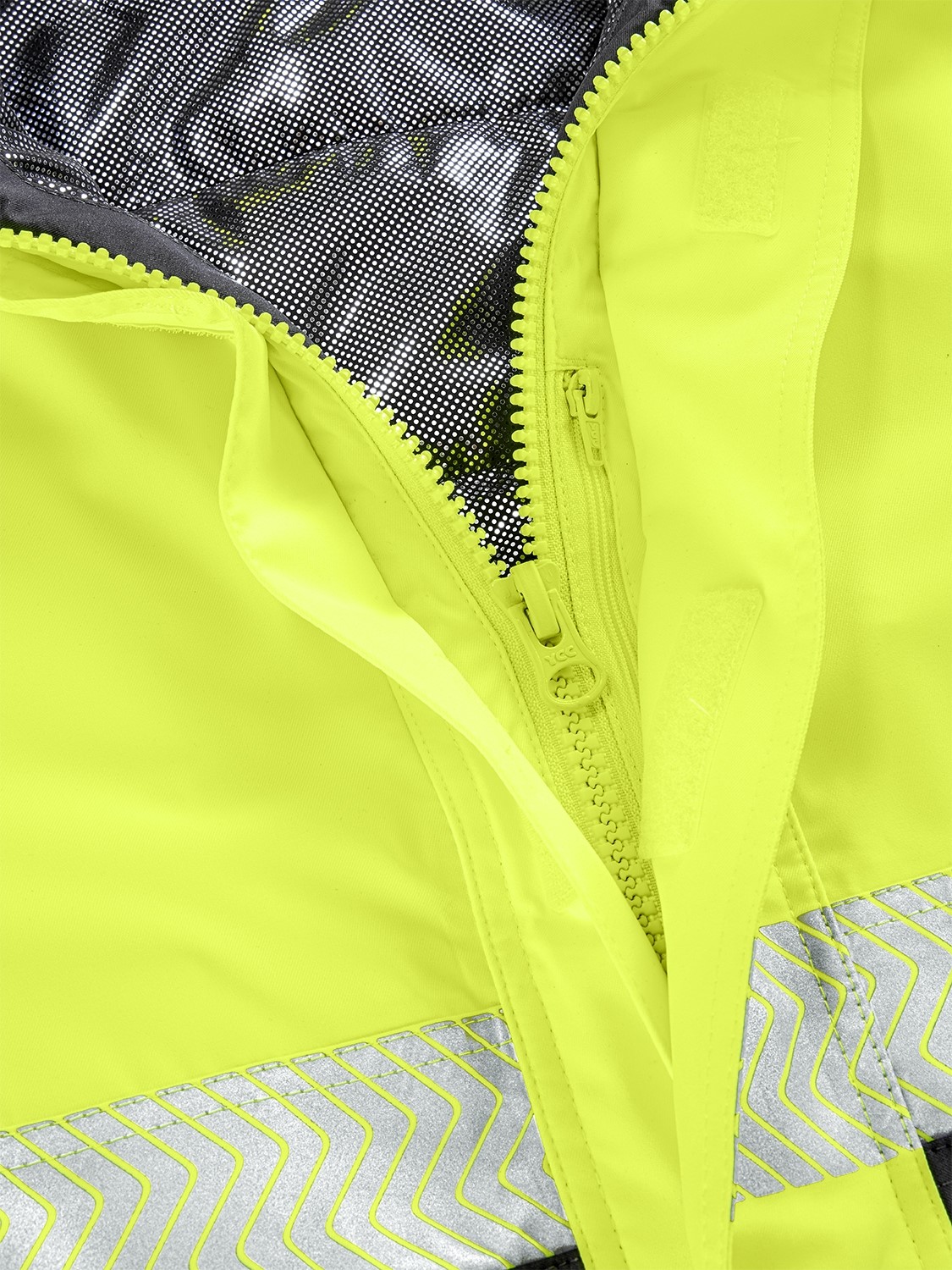 Einsetzbar bei allen Gefahren durch eingeschränkte Sicht schützt der Blouson NEWARK mit seiner wind- und wasserdichten PTFE-Membrane auch vor schlechtem Wetter. Mit dem extrem leichten und atmungsaktiven 4PROTECT®HEATING-Lining in Kombination mit der Fellex® Fast Heat Insulation Wattierung, bleibt die Kälte außerhalb des Blousons. Eine hohe Atmungsaktivität gestattet zudem eine lange Tragedauer. Unterstützt wird dies durch funktionelle Details, wie einem doppelt abgedecktem Front-Reißverschluss sowie einer abzippbaren Sturmkapuze mit diversen Verstelloptionen. Der dunkel abgesetzte Saum- und Manschettenbereich schützt vor schneller Verschmutzung und die abnehmbare ID-Tasche bietet eine durchdachte Funktionalität. Zudem bietet NEWARK durch einen Service-Reißverschluss die unkomplizierte Möglichkeit der Bedruckung in unterschiedlichen Formaten (z.B. 100 x 50 mm Brust und 150 x 100 mm Rücken), ohne einen abwertenden Einfluss auf die Warnschutz-Klassifizierung.