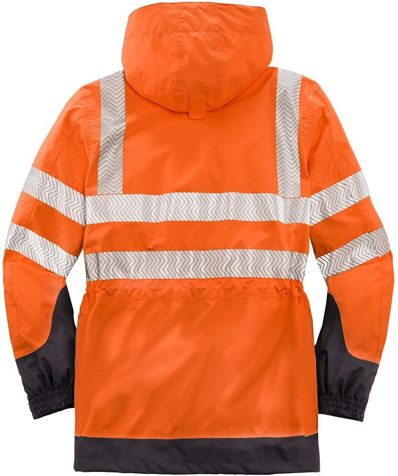 Funktionalität trifft Design. Einsetzbar bei Gefahren durch schlechte Sicht schützt TAMPA mit wind- und wasserdichter Ausstattung auch vor schlechtem Wetter. Unterstützt wird dies durch funktionelle Details, wie einem doppelt abgedecktem Front-Reißverschluss, eine abzippbare Sturmkapuze mit diversen Verstelloptionen sowie der Möglichkeit diverse Jacken/Weste aus dem 4PROTECT®-Programm einzuzippen. Eine hohe Atmungsaktivität gestattet zudem eine lange Tragedauer. Der dunkel abgesetzte Saum- und Manschettenbereich als Schutz vor schneller Verschmutzung sowie eine abnehmbare ID-Tasche zeugen von einer durchdachten Funktionalität. Zudem bietet TAMPA durch einen Service Reißverschluss die unkomplizierte Möglichkeit der Bedruckung in unterschiedlichen Formaten (z.B. 110 x 70 mm Brust und 260 x 100 mm Rücken), ohne einen abwertenden Einfluss auf die Warnschutz-Klassifizierung.