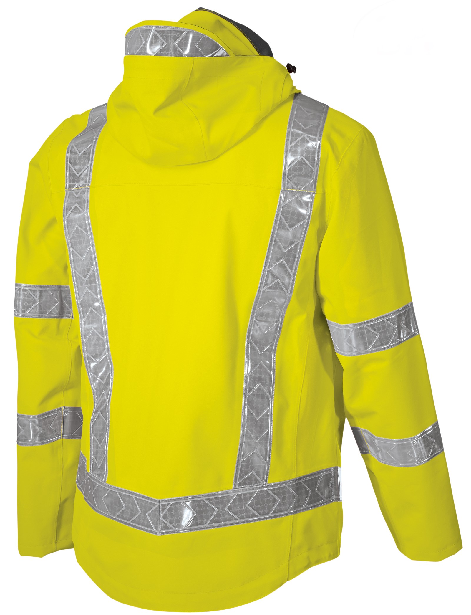 - Je 2 Reflexstreifen auf dem Ärmel, 1 umlaufender Reflexstreifen oberhalb des Saumes, je 2 umlaufende vertikale Reflexstreifen vorn und hinten