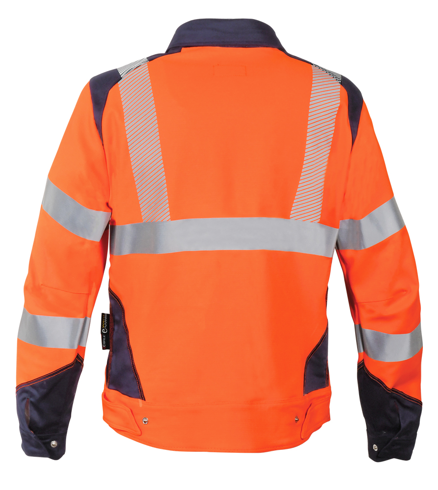 1 horizontaler Reflexstreifen, 2 breite Untertaschen mit Reißverschlüsse, 2 vertikale segmenti erte Reflexstreifen, Badgering, Brusttasche aus E-WARD Stoff mit Reißverschluss, verstellbare Manschetten und Taille Breite mit Schnappverschluss