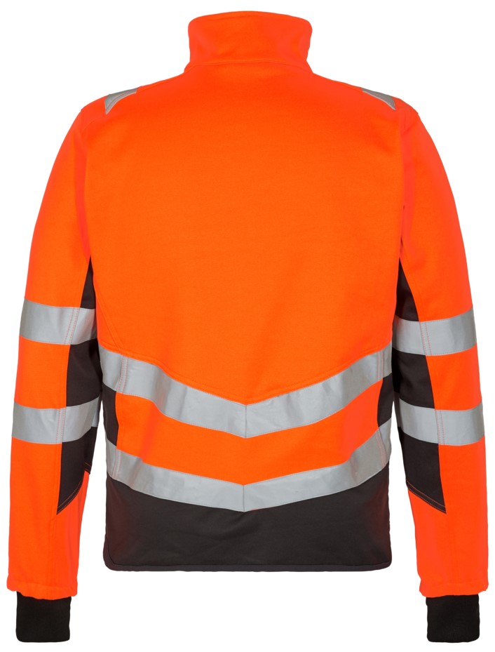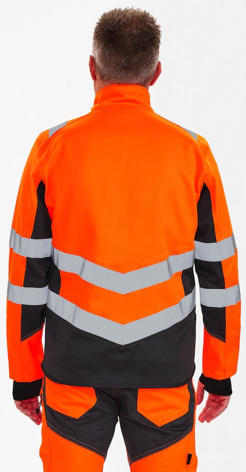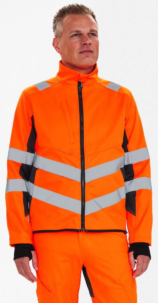 Dehnbare und funktionelle fluoreszierende Arbeitsjacke im modernen Design. Die Jacke hat einen hohen Kragen und ist hinten länger geschnitten. Der dehnbare Stoff bietet viel Komfort und Bewegungsfreiheit. Reißverschluss vorne. Zwei geräumige Seitentaschen sowie eine Brusttasche, jeweils mit Reißverschluss. Zusätzlicher Windfang aus Rippstrick an den Ärmeln. Der Windfang mit Daumenloch kann zum Schutz vor Kälte über die Hand gezogen werden. Reflexstreifen über die Schulterpartie hinweg sowie rund um Ärmel und Taille. Bekleidungsklasse 2. Nach 50 mal Waschen getestet.