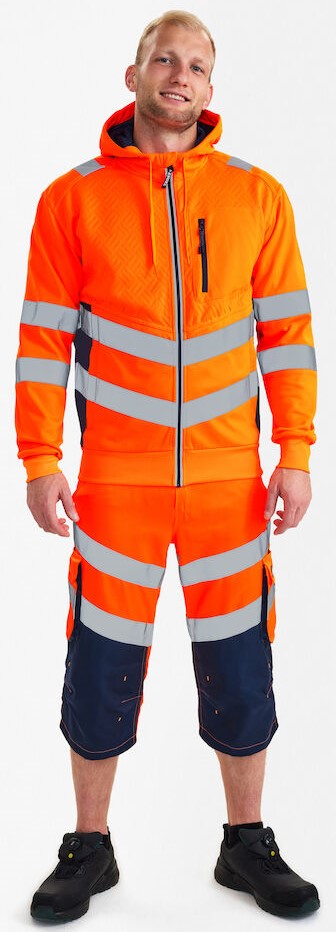 Funktionelle, fluoreszierende Sweatcardigan im modernen, attraktiven Design mit Stretchfutter. Leicht angerauter Innenseite, was den Stoff weich und angenehm macht. Reflektierender Reißverschluss vorne. Zwei geräumige Seitentaschen sowie eine Brusttasche, jeweils mit Reißverschluss. Die Sweat-Cardigan hat eine Waffelstruktur auf Vorderseite und Kapuze. Rippstrick an Ärmeln und Saum unten. Dehnbare Reflexstreifen über die Schulterpartie hinweg sowie rund um Ärmel und Taille. Bekleidungsklasse 2. Nach 25 mal Waschen getestet.