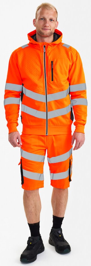 Funktionelle, fluoreszierende Sweatcardigan im modernen, attraktiven Design mit Stretchfutter. Leicht angerauter Innenseite, was den Stoff weich und angenehm macht. Reflektierender Reißverschluss vorne. Zwei geräumige Seitentaschen sowie eine Brusttasche, jeweils mit Reißverschluss. Die Sweat-Cardigan hat eine Waffelstruktur auf Vorderseite und Kapuze. Rippstrick an Ärmeln und Saum unten. Dehnbare Reflexstreifen über die Schulterpartie hinweg sowie rund um Ärmel und Taille. Bekleidungsklasse 2. Nach 25 mal Waschen getestet.