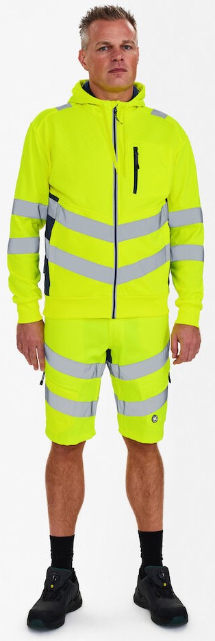 Funktionelle, fluoreszierende Sweatcardigan im modernen, attraktiven Design mit Stretchfutter. Leicht angerauter Innenseite, was den Stoff weich und angenehm macht. Reflektierender Reißverschluss vorne. Zwei geräumige Seitentaschen sowie eine Brusttasche, jeweils mit Reißverschluss. Die Sweat-Cardigan hat eine Waffelstruktur auf Vorderseite und Kapuze. Rippstrick an Ärmeln und Saum unten. Dehnbare Reflexstreifen über die Schulterpartie hinweg sowie rund um Ärmel und Taille. Bekleidungsklasse 2. Nach 25 mal Waschen getestet.