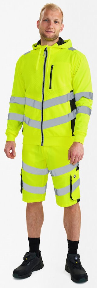 Funktionelle, fluoreszierende Sweatcardigan im modernen, attraktiven Design mit Stretchfutter. Leicht angerauter Innenseite, was den Stoff weich und angenehm macht. Reflektierender Reißverschluss vorne. Zwei geräumige Seitentaschen sowie eine Brusttasche, jeweils mit Reißverschluss. Die Sweat-Cardigan hat eine Waffelstruktur auf Vorderseite und Kapuze. Rippstrick an Ärmeln und Saum unten. Dehnbare Reflexstreifen über die Schulterpartie hinweg sowie rund um Ärmel und Taille. Bekleidungsklasse 2. Nach 25 mal Waschen getestet.