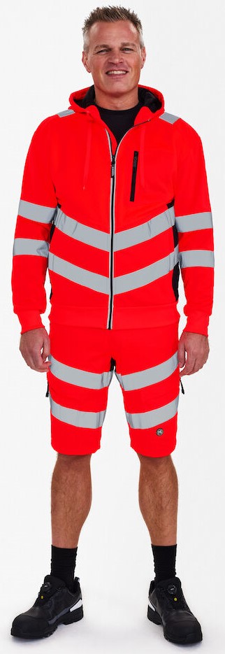 Funktionelle, fluoreszierende Sweatcardigan im modernen, attraktiven Design mit Stretchfutter. Leicht angerauter Innenseite, was den Stoff weich und angenehm macht. Reflektierender Reißverschluss vorne. Zwei geräumige Seitentaschen sowie eine Brusttasche, jeweils mit Reißverschluss. Die Sweat-Cardigan hat eine Waffelstruktur auf Vorderseite und Kapuze. Rippstrick an Ärmeln und Saum unten. Dehnbare Reflexstreifen über die Schulterpartie hinweg sowie rund um Ärmel und Taille. Bekleidungsklasse 2. Nach 25 mal Waschen getestet.