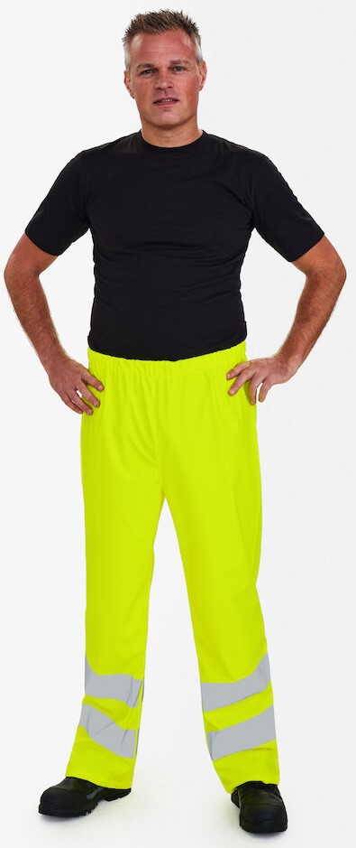 Funktionelle Regenhose mit verschweißten Nähten. Verstellbarer Gummizug in der Taille. Funktionelle Zollstocktasche. Verstellbare Beinweite an den Hosenbeinabschlüssen. Bekleidungsklasse 2. Getestet nach 5 Wäschen