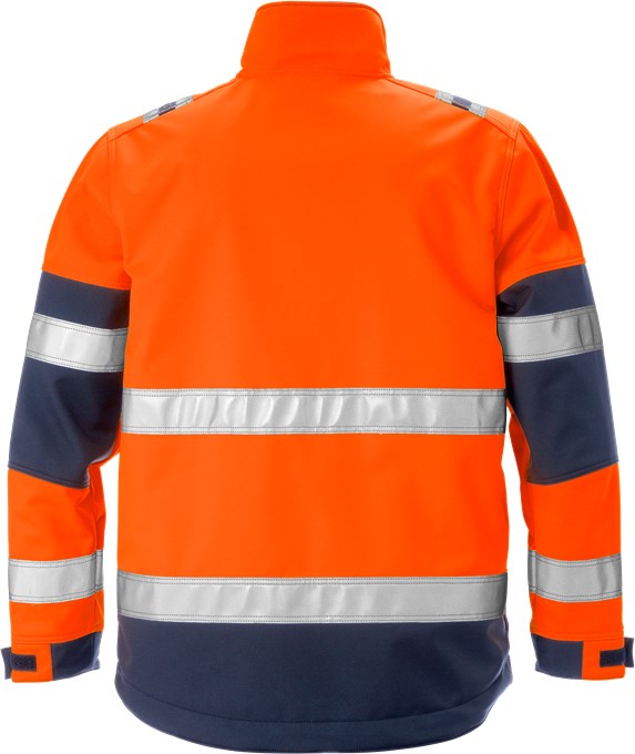 Moderne Warnschutzjacke aus robustem und dehnbarem Softshell-Material zum Schutz gegen Wind und Regen, mit funktionellen Taschenlösungen.