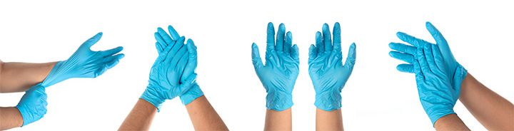 Einweghandschuhe aus Nitril (NBR) sind geschmeidig, elastisch, durchstichfest, haltbar und für den Kontakt mit Lebensmitteln zugelassen. Es sind auch Handschuhe erhältlich, die frei von Vulkanisierungsbeschleunigern sind.