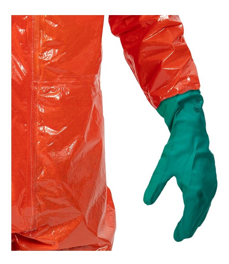 Fest angearbeitete silikonfreie KCL Camatril 730 Handschuhe aus Nitril runden den Anzug ab. Der Handschuhe bietet ihnen eine gute Abrieb-, Stich- und Schnittfestigkeit, ist beständig gegen Säuren, Laugen, langkettige Alkohole und aliphatische und alicyclische Kohlenwasserstoffe.