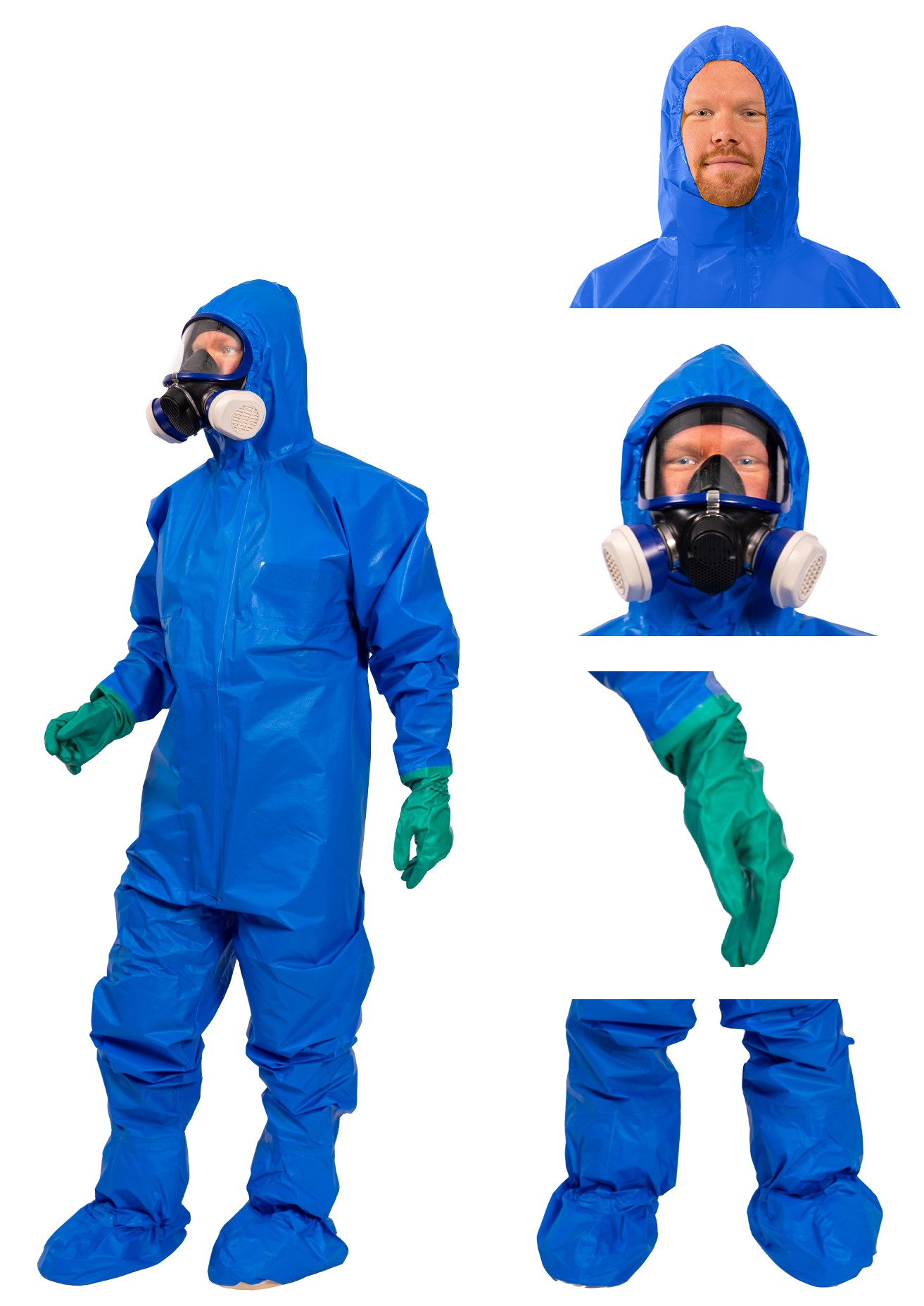 Der Anzug verfügt des Weiteren über Überschuhe mit antistatischer und rutschfester Laufsohle, sowie einem Innenschuh für höhere Dichtigkeit und Kinn- und Reißverschlussabdeckungen, welche ein Eindringen von Flüssigkeiten und Partikeln verhindern.