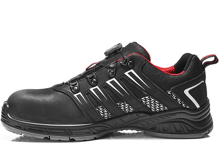 Der sportliche jo_TWIST BOA® Low S1P besteht aus hydrophobiertem Nubukleder und Textilmaterial. Der schwarze Schuh mit grauen Highlights an der Seite des Schafts überzeugt durch seinen modernen Look. Die Sicherheitseigenschaften kommen jedoch nicht zu kurz: eine leichte, aber sehr widerstandsfähige Kunststoffkappe sowie ein metallfreier Durchtrittschutz wehren die Gefahren des Arbeitsalltags erfolgreich ab. Die PU/PU Laufsohle ist gemäß SRC zertifiziert und sorgt für die nötige Rutschhemmung auf glatten Böden. Den modischen Schuh gibt es in den Größen 38 bis 48.