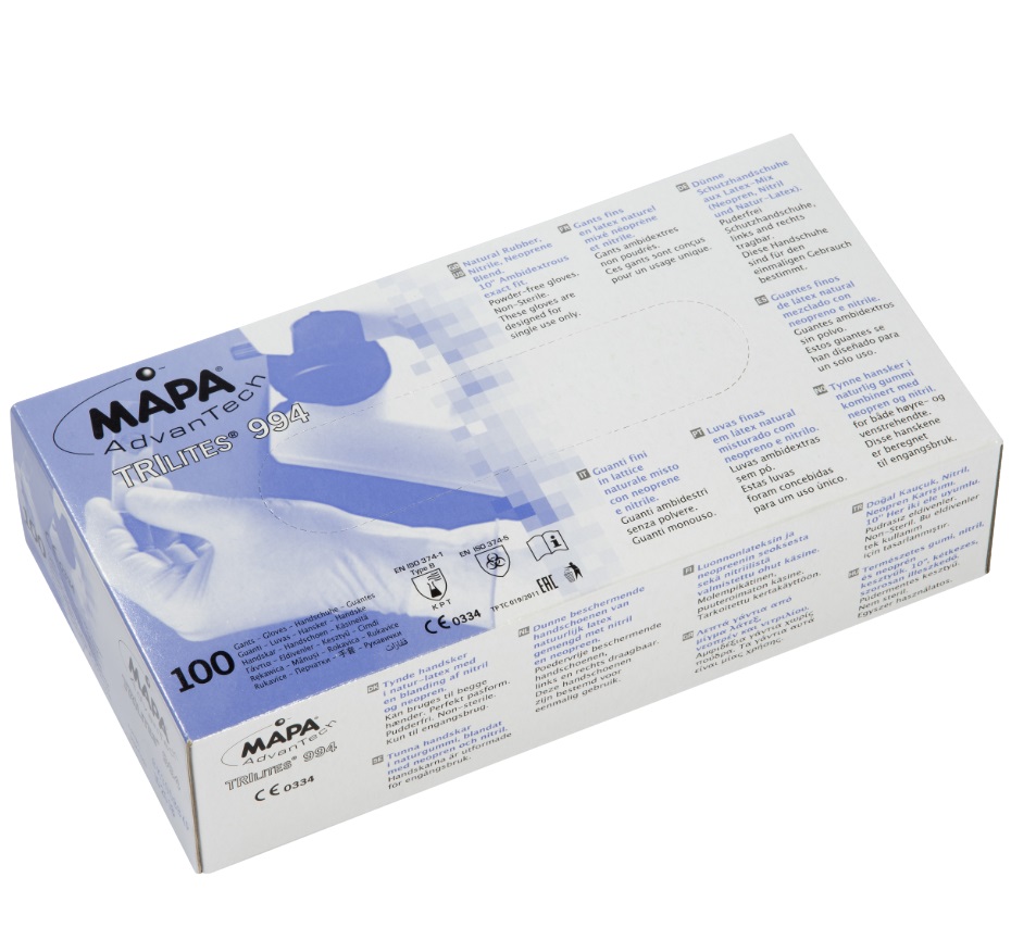 Der Mapa Trilites 994 ist ein einzigartiger Handschuh dank exklusiver Tri-Polymer-Mischung: Kombiniert Vorteile von Naturlatex, Neopren und Nitril. Elastisch, reißfest und erhöhte Resistenz gegen Chemikalienspritzer. Hoher Komfort durch Flexibilität und gute Passform. Gekörnte Fingerspitzen für optimierte Griffigkeit. Hervorragende Fingerfertigkeit, ausgezeichnetes Tastempfinden. Kein Schutz vor mechanischen Risiken. Anwendung: Für Laborarbeiten, Leuchtmittel- Montage, Behandlung von Präzisionsteilen.