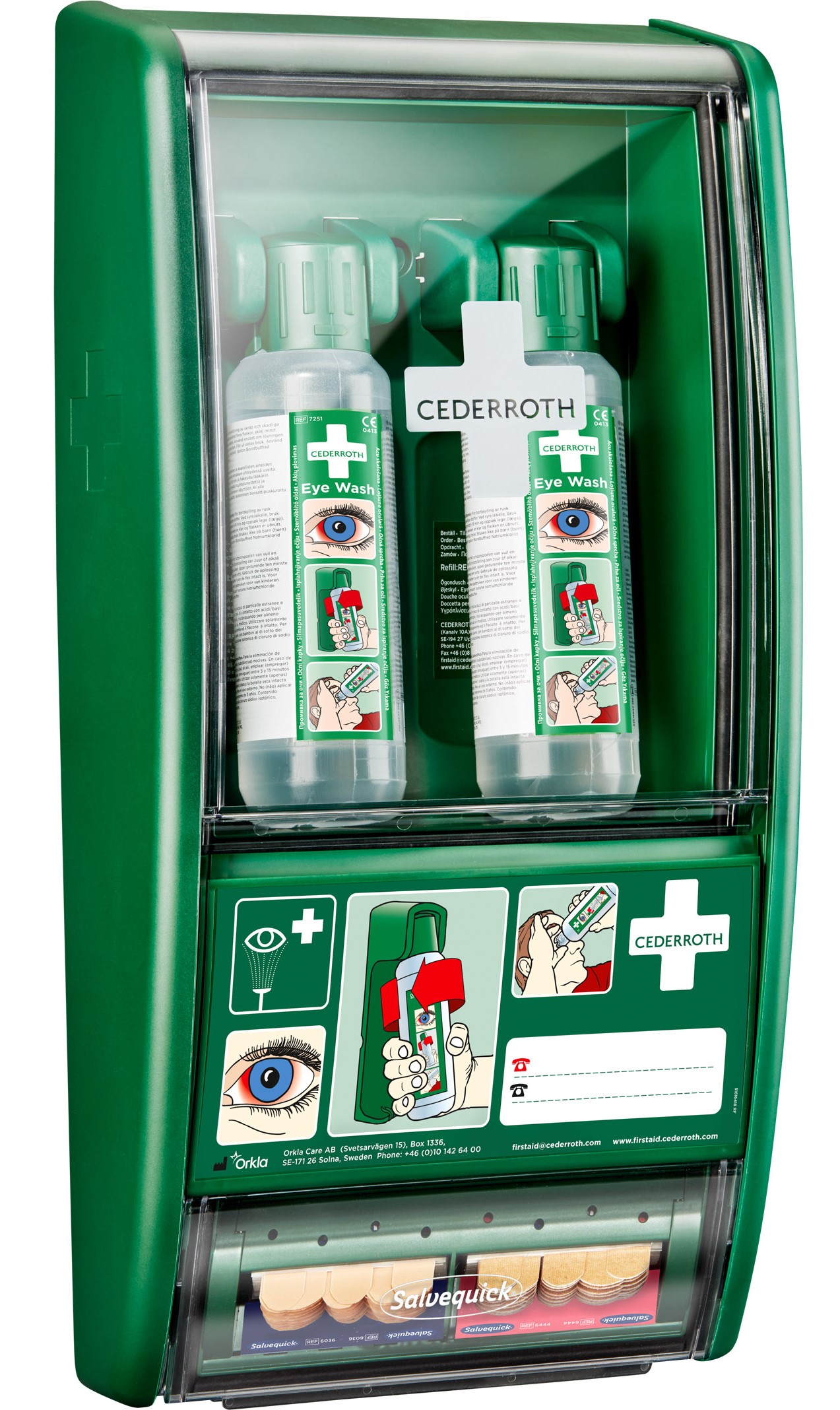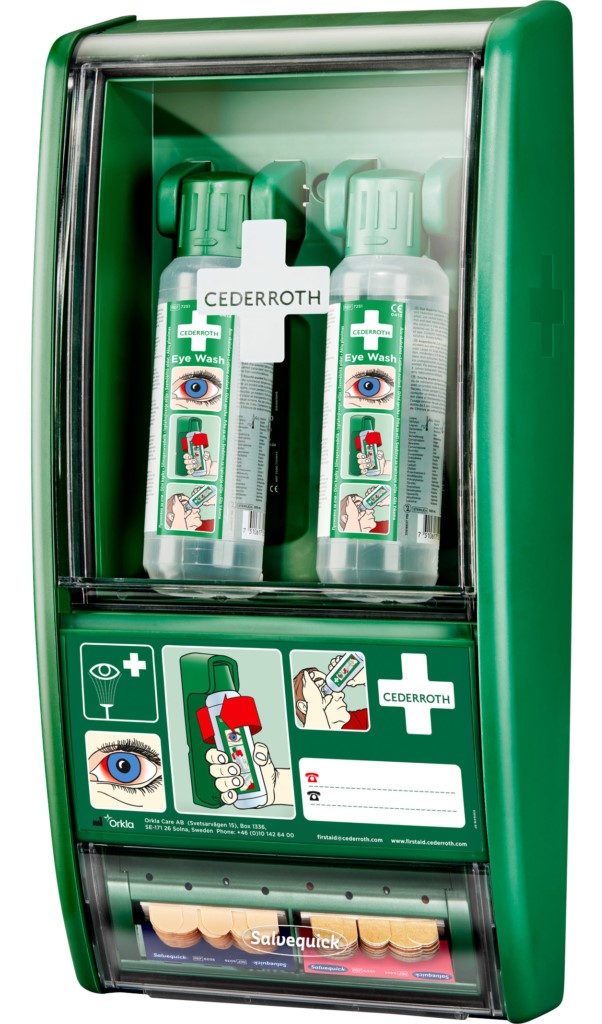 Cederroth Augendusche – nachweislich wirksamer als Kochsalzlösung bei Alkali- und Säurespritzern. Die Augenspülstation ist auf schnelle Hilfe ausgelegt. Die Station bietet Platz für 2 Flaschen, die bei der Entnahme aus der Wandhalterung öffnen. Die Flaschen sind darauf ausgelegt, das Auge ca. eineinhalb Minuten mit kontinuierlich starkem Spülstrahl zu spülen. Die Produkte sind 4,5 Jahre haltbar. Gepufferte Lösung, mit der sich die Chance auf Rettung der Augen höher ist. Unsere Augenspüllösung gleicht den pH-Wert im Auge aus, d. h. sie neutralisiert Alkali- und Säurespritzer. Dabei wirkt sie schneller als herkömmliche Kochsalzlösung. Die Wirkung ist bei Alkalien generell stärker als bei Säuren. Mit dem Salvequick Pflasterspender sind die Pflaster immer zur Hand und einsatzbereit. In unserem Salvequick Pflasterspender werden die Pflaster nach unten herausgezogen. Die Nachfüll-Einsätze sind arretiert. Hierdurch wird Schwund vermieden. Mit dem Platz für Produkte nach eigener Wahl kann der Inhalt an den spezifischen Bedarf jedes Arbeitsplatzes angepasst werden.