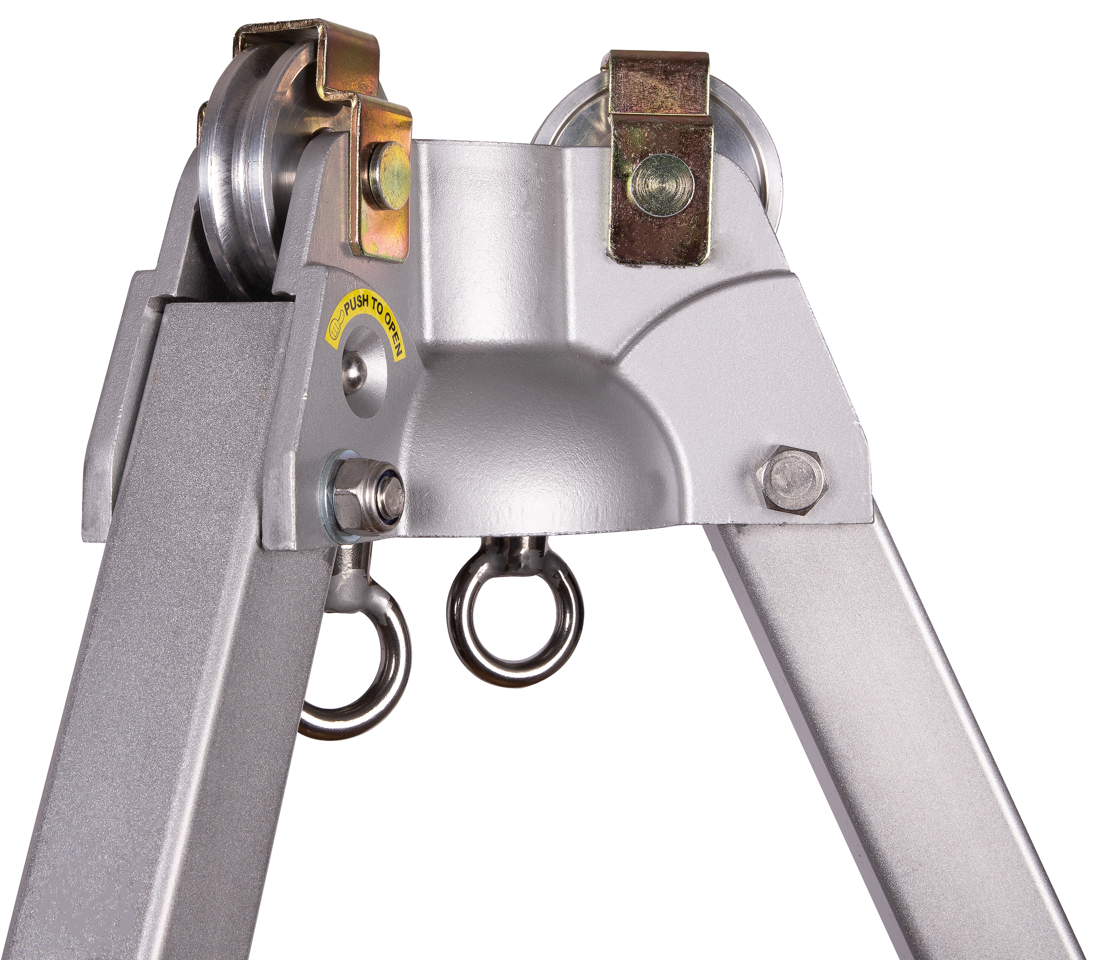 Das Kopfstück ist mit zwei drehbaren Anschlagpunkten zur Befestigung von Vorrichtungen zur Einstellung des Seilzugangs und zwei Umlenkrollen ausgestattet, die die kombinierte und gleichzeitige Verwendung eines Bergungsgeräts Tripos Lift und eines Hubgeräts Cobra Lift mit Bergungsfunktion (separat erhältlich) ermöglichen. Stabile, einfach zu bedienende Teleskopbeine, ausgestattet mit drehbaren Stützfüßen und Sicherheitskette.