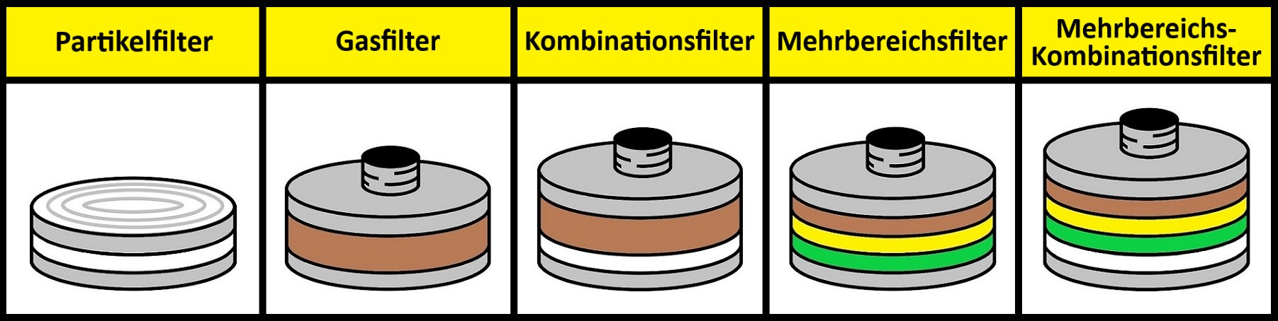In unserem Online-Shop unterscheiden wir nach fünf verschiedenen Filtertypen: Partikelfilter, Gasfilter, Kombinationsfilter, Mehrbereichsfilter und Mehrbereichs-Kombinationsfilter. Die Unterschiede zwischen diesen Filtertypen finden Sie im Folgenden.
